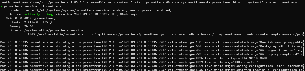 sudo systemctl start prometheus && sudo systemctl enable prometheus && sudo systemctl status prometheus