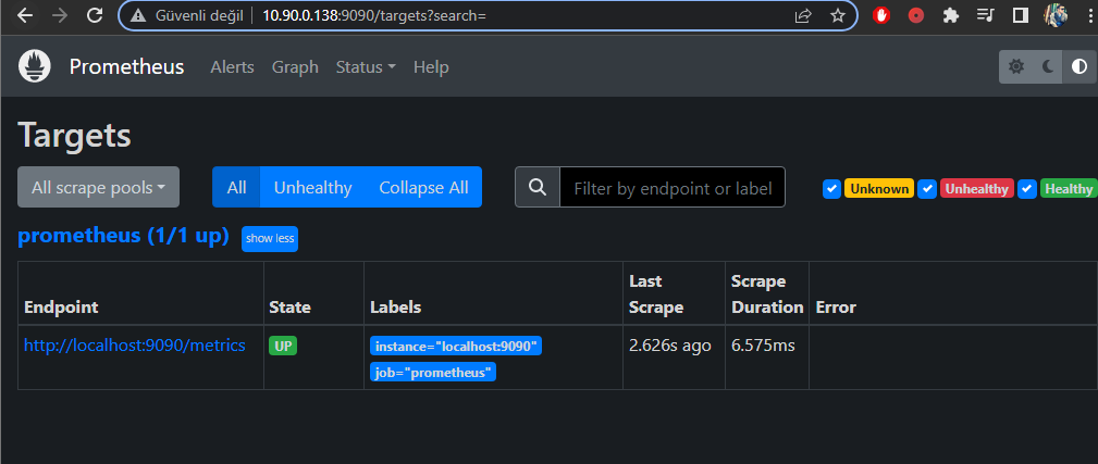 * **Ardından tarayıcı üzerinden prometheus arayüzüne bağlanabiliriz;**